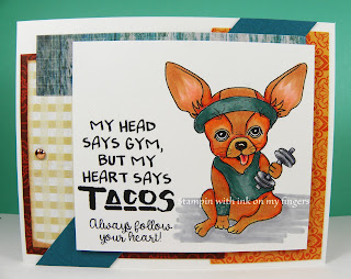 Hello Billie A here with my card using the image from Image That.. I colored the image with copics and added some Silver gelli pen to the headband, top and wrist band. I added him to some Quick Quote scraps. I think he has the right idea on the tacos.. Love Mexican food. If you click on my name it will take you to this card on my blog.