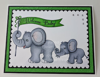 Hi Dawn here with my Imagine That digi - Ellie Tails! I made Ellie and her baby the whole card and coloured them with copic markers. I cut out and popped up their ears, embossed the background and added rhinestones.